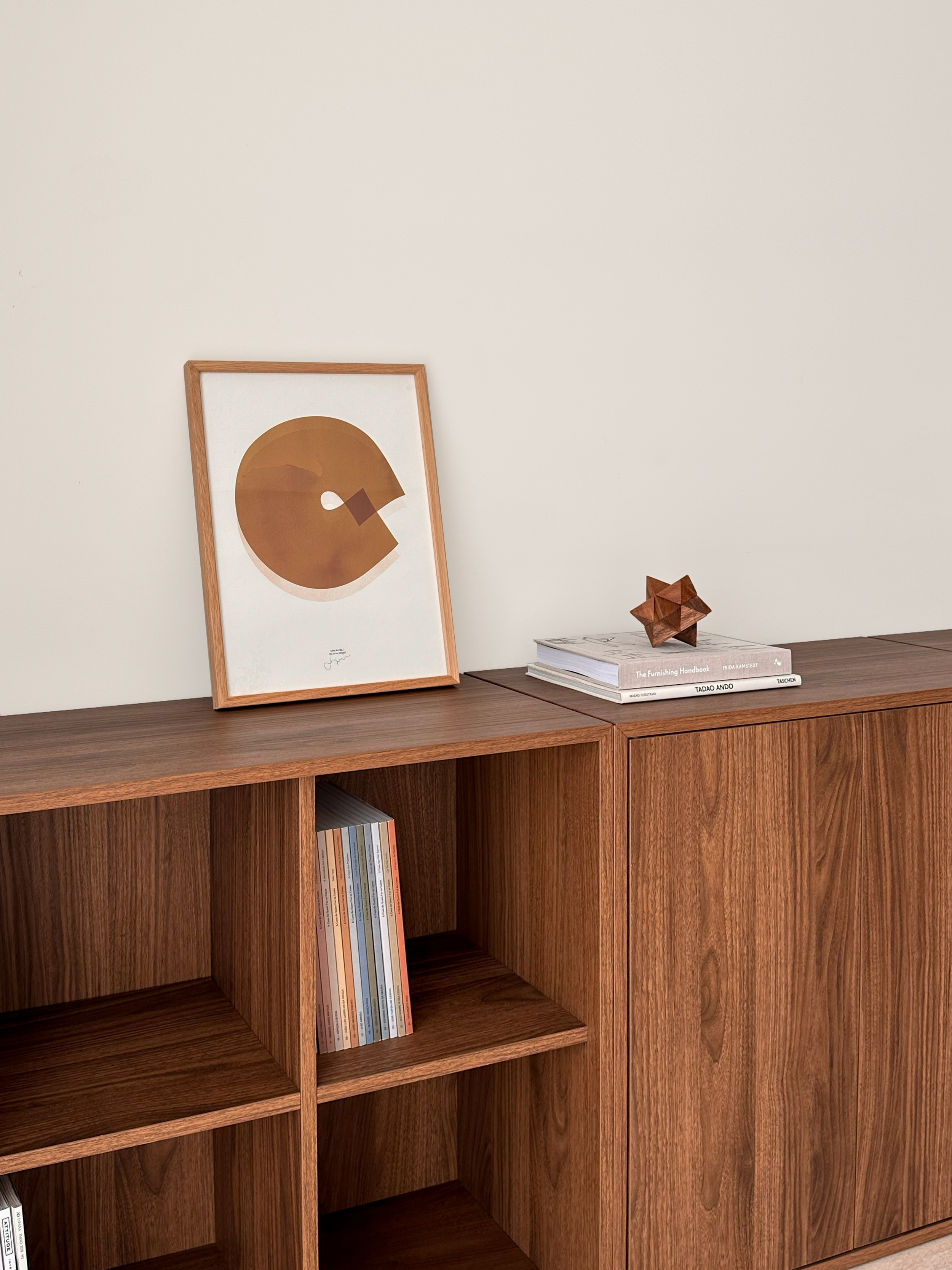 Foram escolhidas soluções de arrumação que permitem uso multifuncional e futura reconfiguração, como os armários-estante e a mesa de jantar extensível.