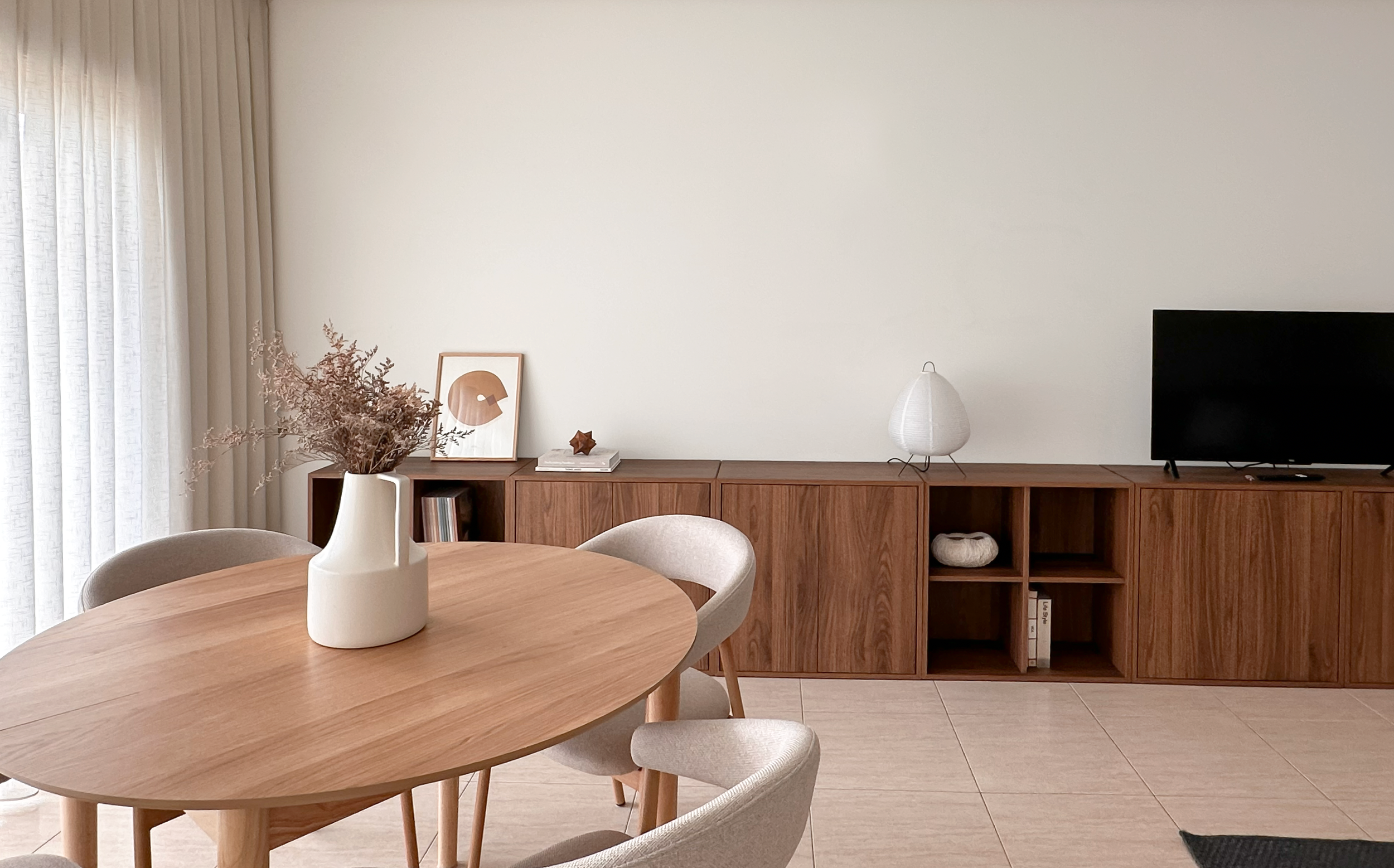 Com estas escolhas, o fluxo de circulação melhorou, assim como a facilidade de manutenção diária. Um espaço antes pesado, com madeiras escuras e peças fora de escala, transformou-se em ambiente leve, harmonioso e funcional.